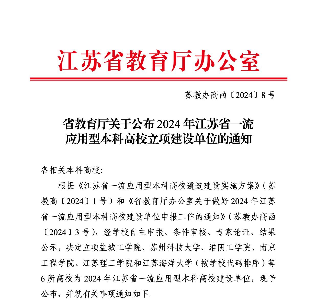 The Jiangsu Provincial Department of Education recently issued the Notice on Announcing the 2024 Construction Organizations for Jiangsu Provincial First-Class Applied Undergraduate Universities, officially approving Yancheng Institute of Technology as part of the first batch of Jiangsu Provincial First-Class Applied Undergraduate Institutions.