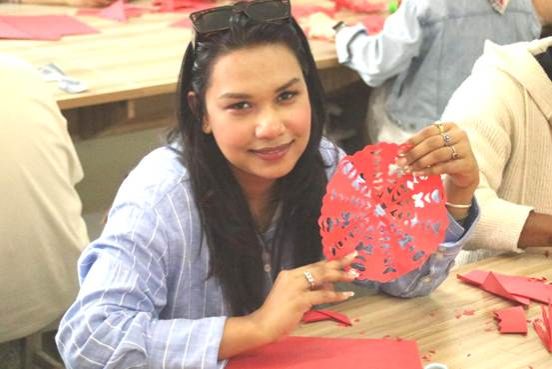 The paper-cutting session opened with Mr. Niu showcasing different paper-cutting works for international students that illustrated the unique artistic charm of Chinese folk culture. When the familiar Paper-cutting works of “Salt Cube” Yancheng TV Tower, “Bronze Horse” in the downtown and other landmark buildings in Yancheng appeared on the screen, exclamations of “Wow” could be heard throughout the room. In the practical session, under the careful guidance of Mr. Niu, international students all picked up scissors and tried to cut out simple patterns. Their initial raw movements gradually became skillful, and the original crooked lines gradually became smooth. They transformed crimson sheets into symmetrical window grilles, fluttering butterflies, endearing pandas, and other vivid works.