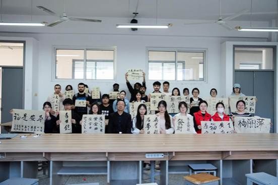 Mr. Shi introduced the calligraphy art with fluent English, from the Oracle to running scripts, systematically interpreting the cultural lineage and aesthetic changes of Chinese calligraphy for three thousand years. Students listened in rapt silence and were absorbed in his exquisite analysis of classic calligraphic styles such as “Yan Jin Liu Gu” and “grace of the Two Wangs”. In the interactive session, philosophical questions such as “How can soft-tipped brushes create forceful strokes that ‘pierce the paper’?” kept popping up one after another, and Mr. Shi's classic answers occasionally drew waves of admiration. The practical stage turned theory into action. Mr. Shi demonstrated the key points of “firm fingers, hollow palm, level wrist, upright brush” when holding the brush. The rhythmic beauty of his brushstrokes impressed students. Then students carefully wrote on the paper, starting from the most basic gestures to experience the ups and downs of the brushstrokes. Uzbek student Hamroev Shakhzod, after painstaking practice, felt excited about his first brush writing of China (中国).
