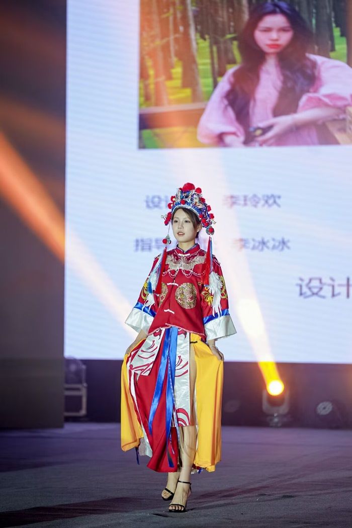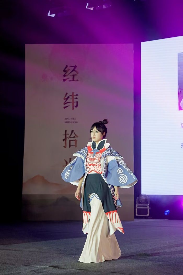This exhibition, themed “Jingwei Shiguang”, uses “Jingwei” to signify the vertical and horizontal integration of traditional craftsmanship and modern technology, while “Shiguang” symbolizes the refinement of cultural essence and the capture of contemporary style. A total of 45 series comprising 181 graduation design works were showcased. Students drew inspiration from intangible cultural heritage such as Huai Opera, blue calico, and paper-cutting. Employing techniques like weaving, patchwork, and embroidery, they ingeniously merged Eastern aesthetic elements like cloud patterns, bronze vessel motifs, and ethnic totems with Western elements like Gothic geometric lines and Rococo intricate embellishments. This demonstrated innovative interpretations of Chinese traditional culture and the cultivation of an international fashion perspective.