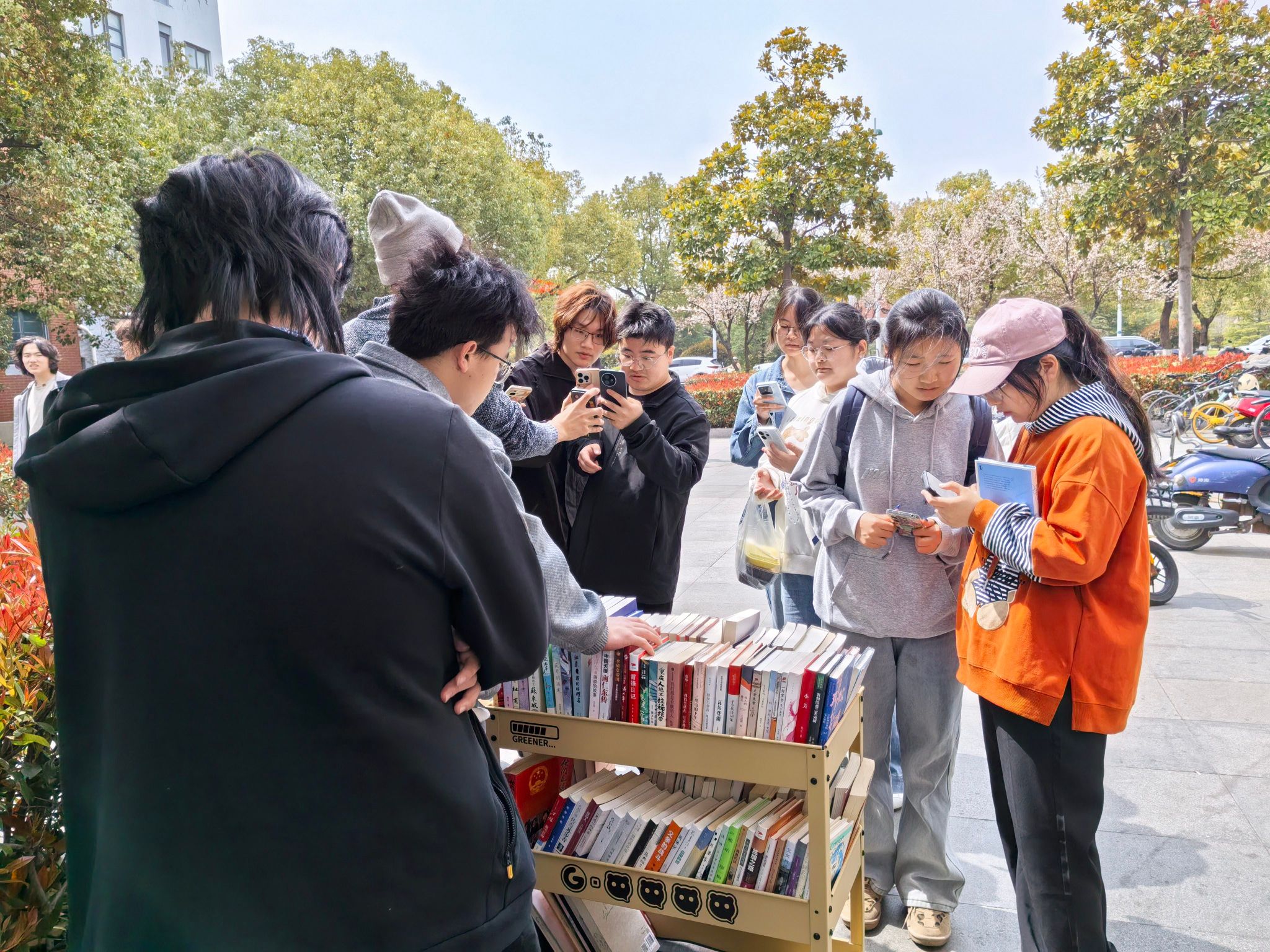 师生在流动书摊前选书