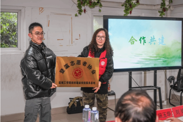纺织服装学院老师宣读校社合作共建方案,现场签约结对,获颁服务基地牌匾,为青年学子服务社会搭建了更广阔、更专业的实践平台。