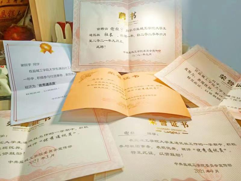 从干事到社长再到卸任,三年来在通讯社的点点滴滴都是谢欣宇十分珍贵的经历,回忆起这三年的故事,她更是如数家珍。从第一次采访时的紧张,到后来的游刃有余,从一遍遍改稿时的抓耳挠腮,到看到稿件发表时的欢呼雀跃,每一次活动她都铭记于心。在通讯社的三年,她每一学期都被评为“优秀通讯员”,一摞奖状和聘书,是她这三年的见证。