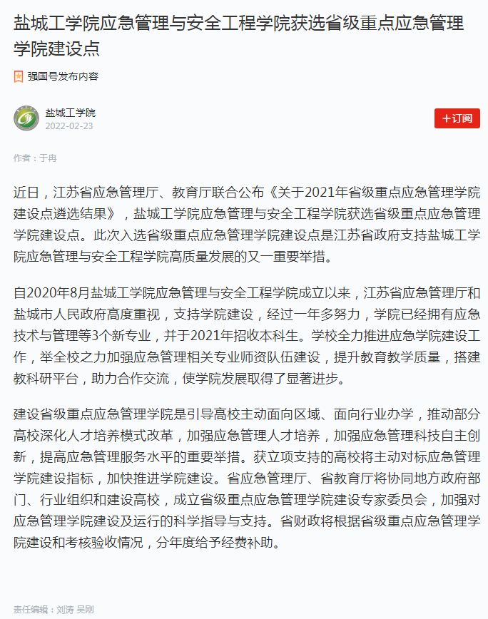 近日,江苏省应急管理厅、教育厅联合公布《关于2021年省级重点应急管理学院建设点遴选结果》,盐城工学院应急管理与安全工程学院获选省级重点应急管理学院建设点。此次入选省级重点应急管理学院建设点是江苏省政府支持盐城工学院应急管理与安全工程学院高质量发展的又一重要举措。