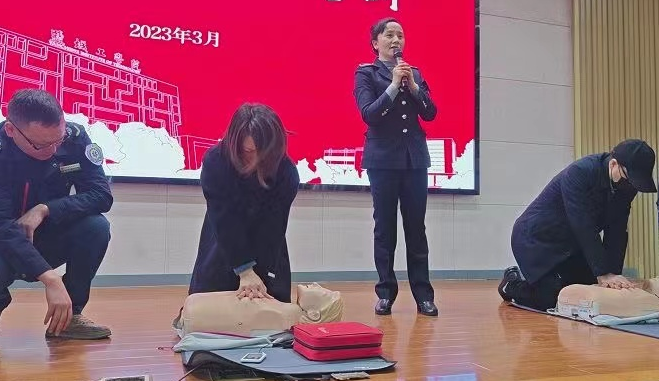 盐城市急救医疗中心培训科科长施亚萍以“关爱生命、救在身边”为题作应急救护培训,着眼现代救护新概念,就紧急呼救、EMSS的含义,“第一反应人”“救命黄金时刻”“生存链”内涵和重要性开展理论讲解,就心肺复苏及AED的使用进行现场演示和实践操作,带领大家了解心肺复苏的重要性,掌握成人、儿童心肺复苏的操作步骤和AED的寻找、操作方法。