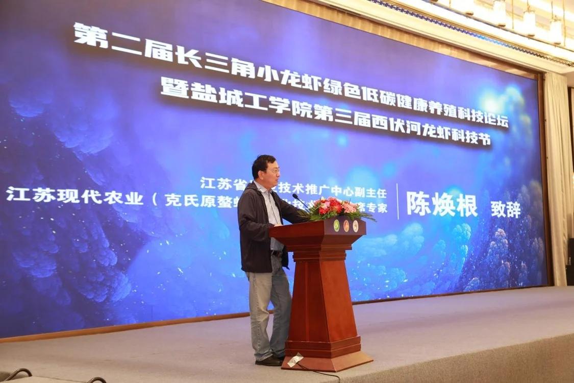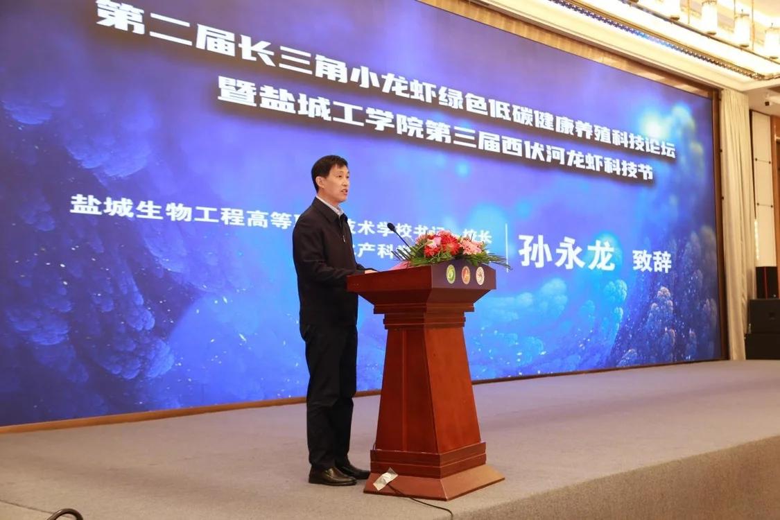 盐城生物工程高等职业技术学校书记、校长,盐城水产科学研究院院长孙永龙在致辞中介绍了盐城水产科学研究院情况,并强调研究院要构建完善以企业为主体、市场为导向、政产学研相结合的现代渔业产业技术支撑体系,为盐城渔业发展把脉引航,推动盐城渔业全产业链项目课题科学研究。2023年研究院把中国水科院淡水渔业研究中心、盐城工学院联合申报的“克氏原螯虾(小龙虾)大规格绿色低碳养殖关键技术研究”作为重点课题项目,通过项目的实施,将从根本上解决小龙虾因传统“繁养一体”养殖而导致的种质退化、抗逆性弱、虾苗成活率低、大规格比例低、产量不稳及病害多发的问题,从而促进小龙虾产业链进一步向绿色、抗病、优质方向发展和延伸,推动盐城及长三角地区小龙虾产业转型升级,实现科技振兴乡村,解决农户增产、增收。