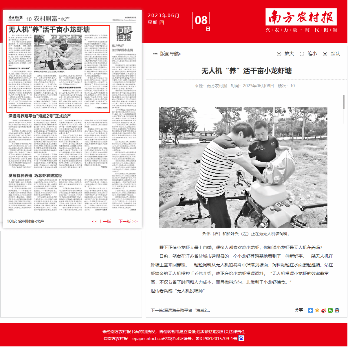乔伟称,每个虾塘每天可以捕捞小龙虾200斤左右,“自从使用无人机投喂后,小龙虾的个头明显增大了,很多小龙虾都达到七八十克。”2022年5月,江苏进峰农业科技有限公司还和盐城工学院研究团队一同起草并发布了盐城市的《无人机饲料投喂操作规程》,共同助力无人机在小龙虾领域的推广和应用。乔伟说:“盐城当地有很多小龙虾企业都在用我们的操作规程,大家都节省了时间和人力成本,取得了显著的经济效益。”