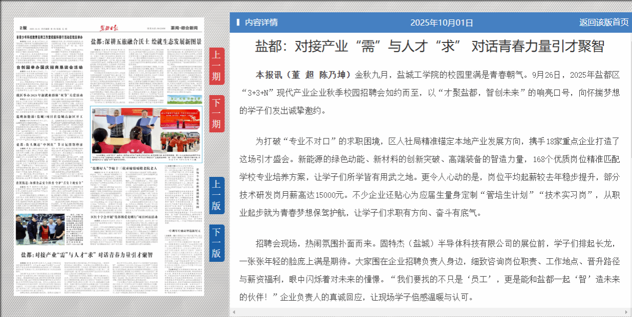 本报讯(董 超 陈乃坤)金秋九月,盐城工学院的校园里满是青春朝气。9月26日,2025年盐都区“3+3+N”现代产业企业秋季校园招聘会如约而至,以“才聚盐都,智创未来”的响亮口号,向怀揣梦想的学子们发出诚挚邀约。