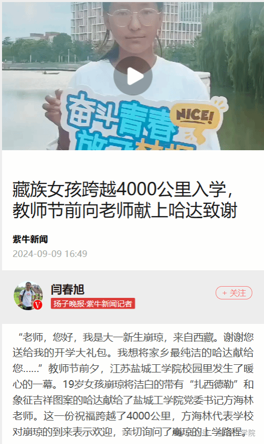 盐城工学院构建学科特色与民族团结教育融合平台,为推动各民族团结统一助力,为实现中华民族伟大复兴的中国梦赋能。 “老师,您好,我是大一新生崩琼,来自西藏。谢谢您送给我的开学大礼包。我想将家乡最纯洁的哈达献给您……”2024年教师节前夕,在校园里发生了暖心的一幕。19岁女孩崩琼将洁白的带有“扎西德勒”和象征吉祥图案的哈达献给了盐城工学院党委书记方海林老师。这一份祝福跨越了4000公里,方海林代表学校对崩琼的到来表示欢迎,亲切询问了崩琼的上学路程。