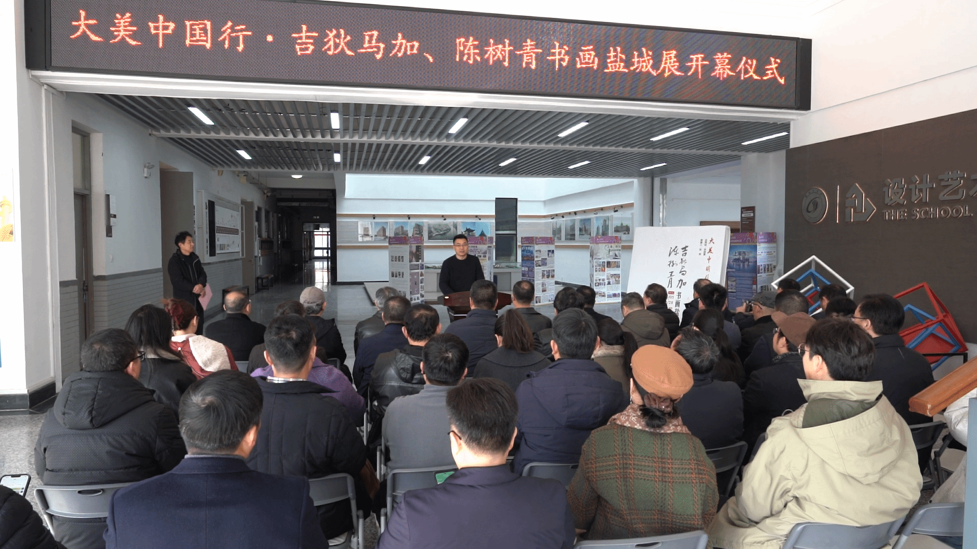 2月5日,由中国诗书画研究会和我校联合主办,中国诗书画研究会教育分会和我校设计艺术学院共同承办的“大美中国行”吉狄马加、陈树青书画盐城展在我校希望大道校区润美楼第一展厅开幕。民进中央文化艺术委员会委员、中国诗书画研究会驻会副会长李国富,北京化工大学直属艺术设计系主任庄一兵,中国诗书画研究会教育分会副会长、参展画家代表陈树青专程从北京赶来出席开幕式。党委副书记、校长邵荣,党委常委、副校长王伟,党委常委、宣传部部长奚新国,以及社会各界书画爱好者、我校师生代表等50余人参加开幕式并观展。开幕式由我校设计艺术学院院长张军主持。