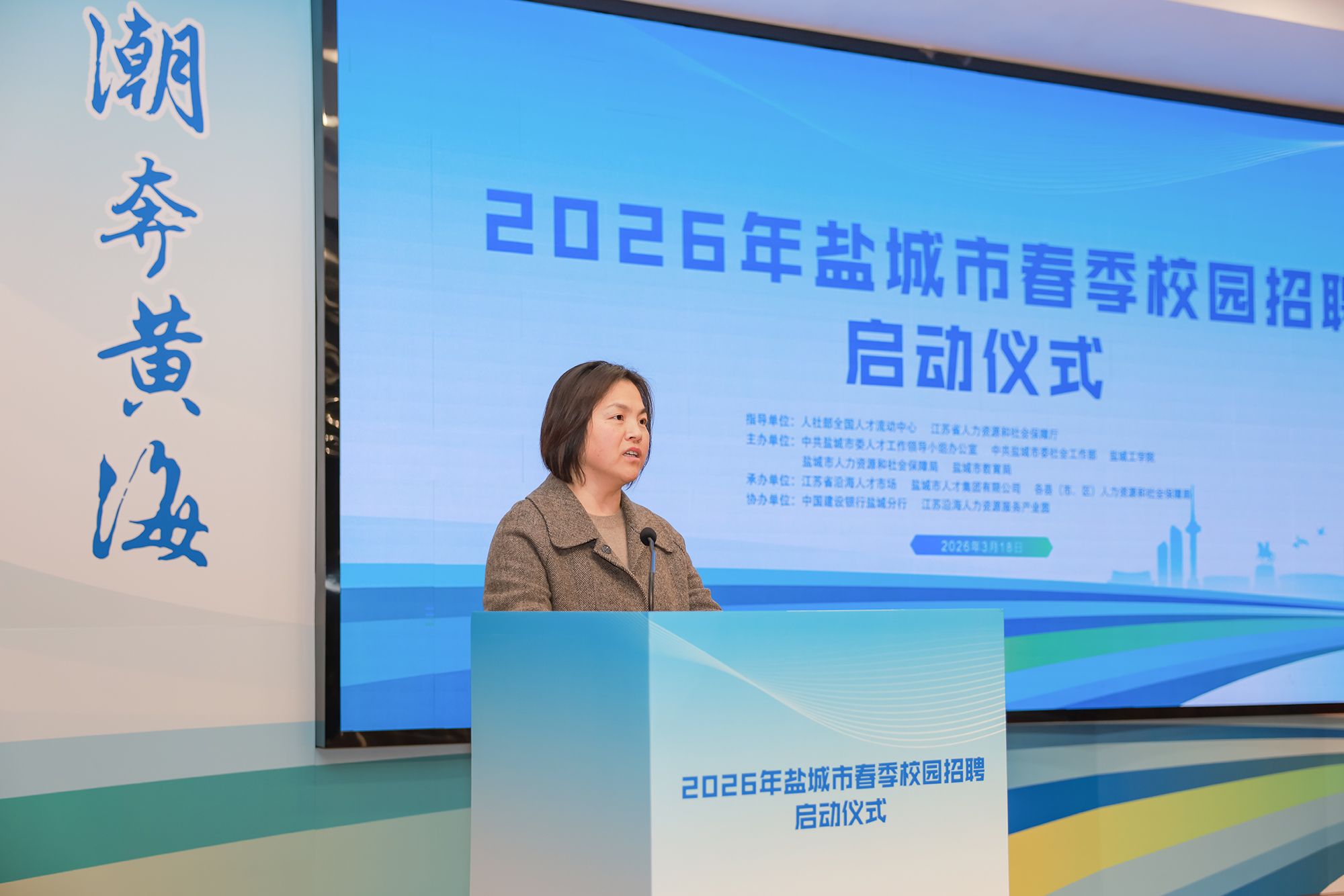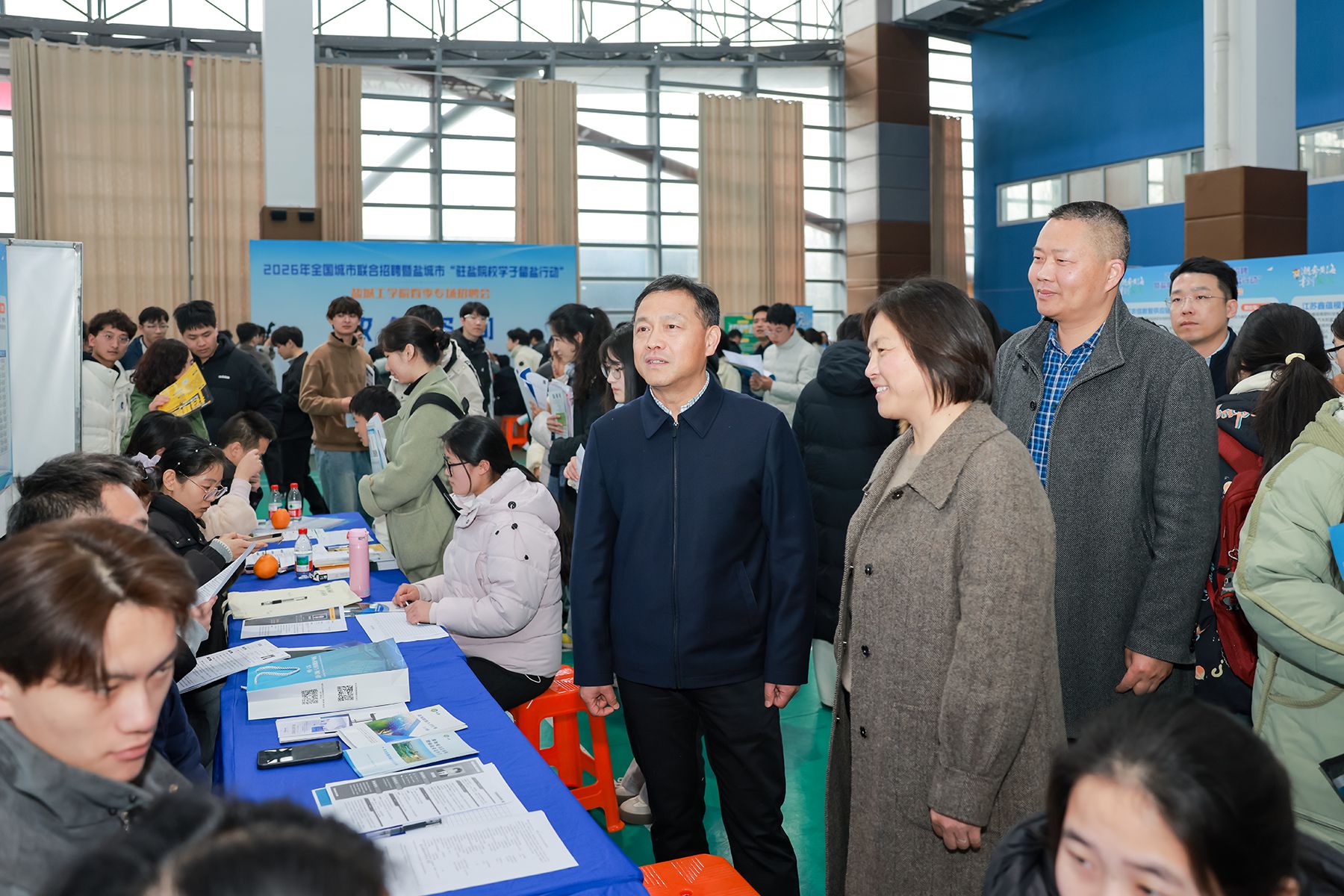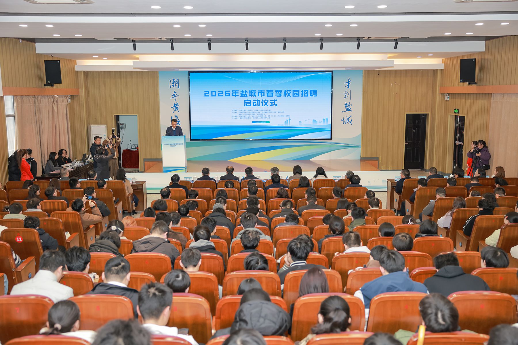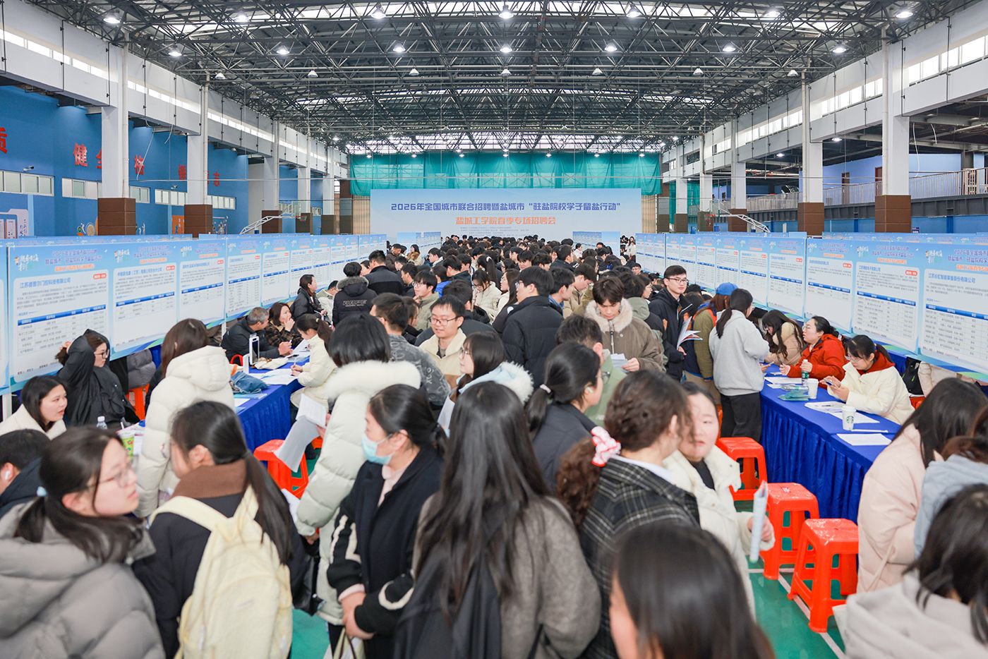 春和景明,聚力前行。为持续深入落实盐城市“黄海明珠人才计划”、纵深推进“驻盐院校学子留盐行动”,进一步集聚青年人才、引导更多驻盐院校毕业生留盐就业创业,3月18日下午,由盐城市委人才工作领导小组办公室、盐城工学院、盐城市人力资源和社会保障局、盐城市教育局、盐城市政府国有资产监督管理委员会联合主办,江苏省沿海人才市场、盐城市人才集团有限公司、盐城工学院招生与就业创业指导处及盐城市各县(市、区)人力资源和社会保障局共同承办的2026年全国城市联合招聘暨盐城市“驻盐院校学子留盐行动”盐城工学院春季专场大型招聘会,在我校希望大道校区风雨操场成功举办。