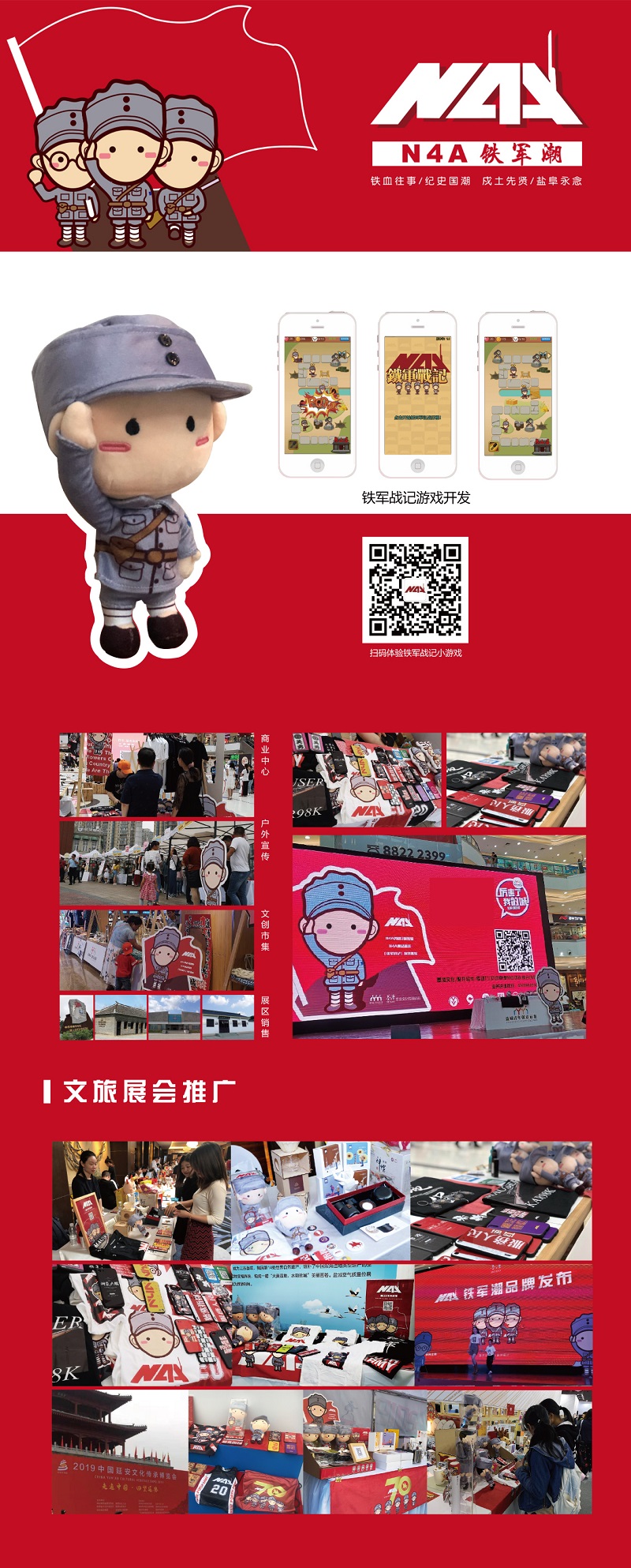 “N4A铁军潮”系列产品先后参加延安文化传承博览会、第二届长三角国际文化产业博览会、创+生活节(上海)、南京路上好八连纪念馆、江苏省版权博览会、盐城文旅纪念品上海推荐会等展出,产品得到了广大消费者的喜爱,同时对红色文化的传播开辟了市场驱动型的爱国主义教育新路径。