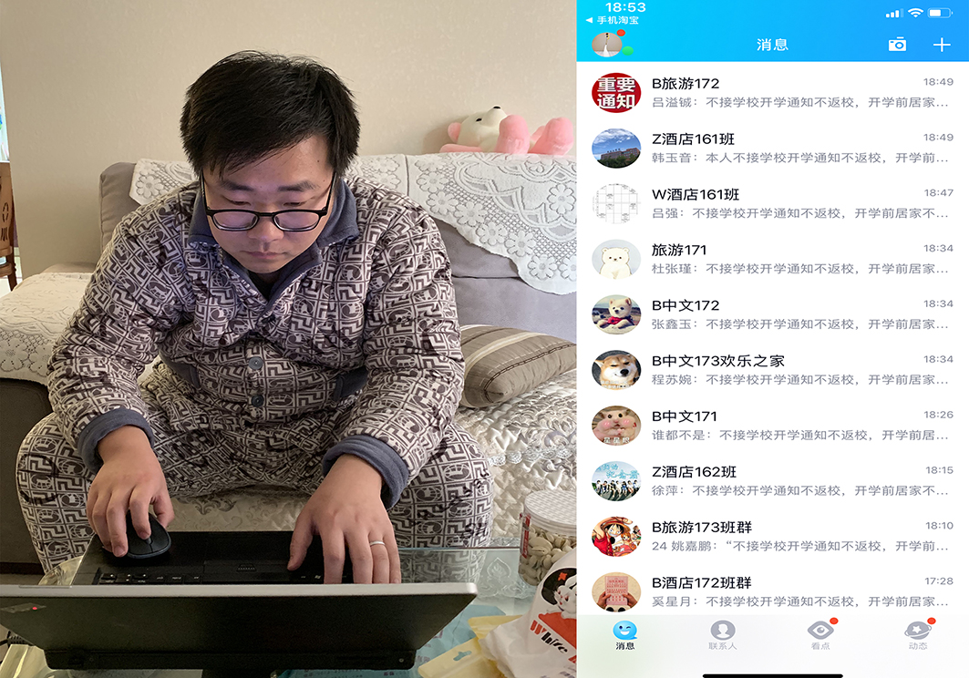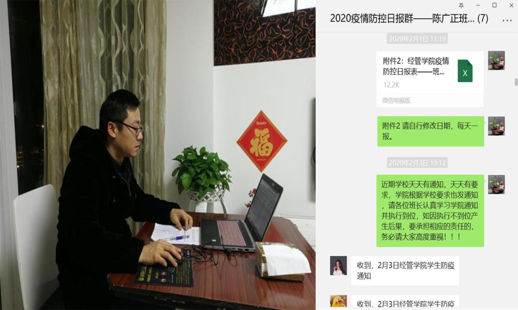 他认为学生在哪里,坚守就应该在哪里,辅导员作为离学生最近的人,更要尽心尽力做好学生的守护者,与学生一起战“疫”。在家办公、在线工作,教育管理难度加大,但他坚守岗位、主动作为,站好岗、守好渠、种好田、尽好责。他按照学校的“网格化”管理要求,在学院的指导下,成立以学生为中心、以党员和主要学生干部为依托的疫情防控网络,全面摸排学生信息。充分利用班级QQ群、微信群传达学校重要通知,切实落实责任班级每一位学生“不提前返校报到”的要求。通过网络主题班会做好疫情防控知识宣传、思想引领、教育引导等工作,将学校的关心、关爱传递到每一位学生。