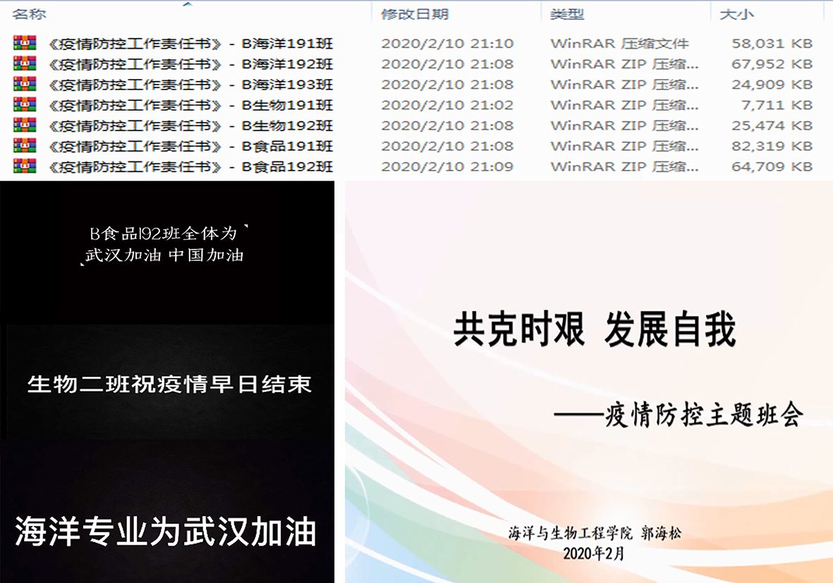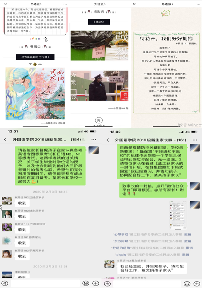 新冠肺炎疫情爆发以来,他始终牵挂着学生的健康,积极投入疫情防控工作,做到身未动,心已行。他的手机保持24小时“不断线”,工作由“面对面”变为“键对键”,他精准掌握学生假期情况,细化每日疫情报告,建立与每位学生“一对一”的联系机制,落实信息全员覆盖,不漏一人。防控期间,他注重向学生宣传防控知识、传达学校要求,引导学生以积极的心态面对疫情。此外,他积极引导学生以文字、书画、摄影等方式向所有奋战防疫一线的医务工作者和工作人员致敬!一起为武汉加油!为中国加油!