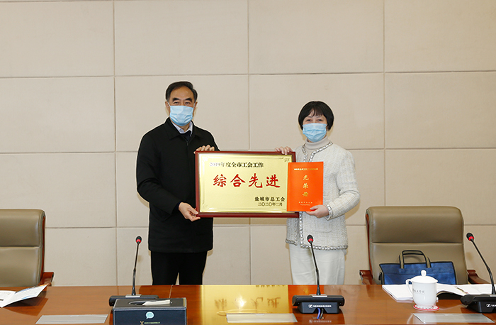 许宝贵代表市总工会向我校授予“盐城市工会工作综合先进单位”牌匾,蔡华宣读了表彰决定。许宝贵对我校作为全市仅有的32家工会之一获此综合荣誉表示热烈的祝贺,对学校党政领导长期以来对工会工作的高度重视表示肯定。他希望校工会珍惜荣誉,再接再厉,继续把服务教职工的工作做实做细,在恢复学校的正常工作生活秩序和“四新盐城”的建设中发挥工会应有的作用。