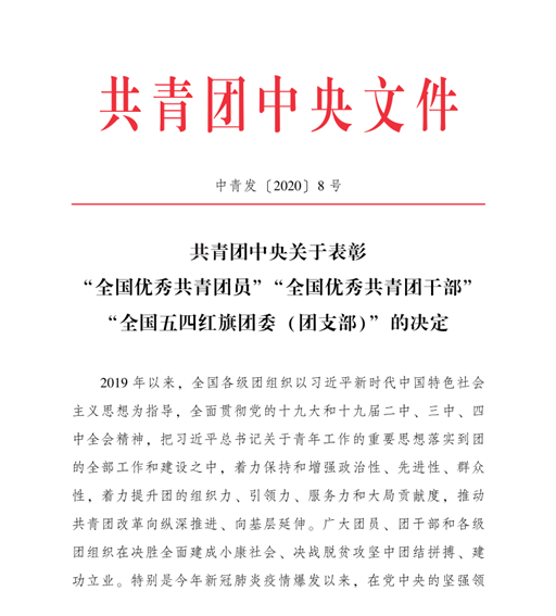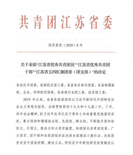 日前,为表彰先进,宣传先进,激励团员、团干部和各级团组织奋发有为、再创佳绩,共青团中央、共青团江苏省委分别下发了《共青团中央关于表彰“全国优秀共青团员”“全国优秀共青团干部”“全国五四红旗团委(团支部)”的决定》(中青发[2020]8号)、《关于表彰“江苏省优秀共青团员”“江苏省优秀共青团干部”“江苏省五四红旗团委(团支部)的决定”》(团苏委发[2020]8号)。我校团委书记包雅玮荣获“全国优秀共青团干部”荣誉称号,设计艺术学院B服装172班余丹丹同学荣获“江苏省优秀共青团员”荣誉称号,共青团盐城工学院委员会荣获“江苏省五四红旗团委”荣誉称号。其中,“全国优秀共青团干部”是共青团中央授予团干部的最高荣誉,全国有357名团干部获此奖项。
