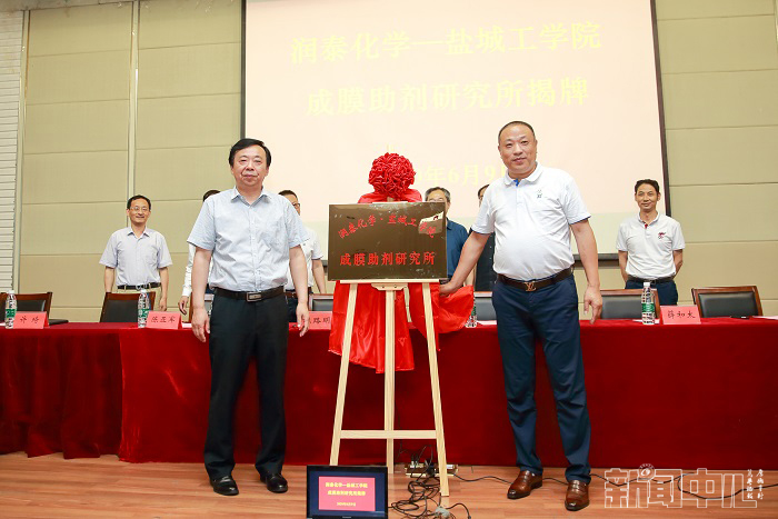 副校长王路明与润泰化学股份有限公司董事长张世元共同为“润泰化学盐城工学院成膜助剂研究所”揭牌