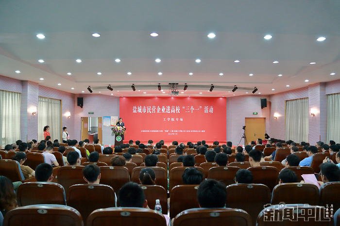 7月14日下午,盐城市民营企业进高校“三个一”活动(一场创业创新分享会、一场企业人才招聘会和一场校企产学研对接会)工学院专场在我校南校区土木工程馆一楼报告厅成功举办。江苏省工商联党组成员、省工商联副主席郭东升出席并讲话,市委常委、组织部部长、统战部部长柏长岭致辞。市政协副主席、市工商联主席吕拔生,我校校长方海林,校党委副书记薛浩,校党委常委、副校长邵荣、王路明,校党委常委、统战部部长姚军,各县(市、区)有关部门负责人,企业家代表,我校相关职能部门、二级学院党政负责同志,部分师生参加了本次活动。本次活动由市委统战部副部长、市工商联党组书记陈湘珍主持。