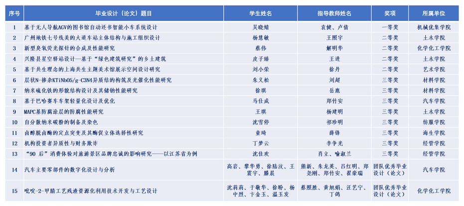 其中,机械优集学院袁健、卢倩老师指导的吴晓婧同学获一等奖,土木学院王照宇、化学化工学院解明华、土木学院王进、艺术学院徐丹老师分别指导学生获二等奖,汽车学院熊新、化学化工学院蔡照胜分别带领团队获团队优秀毕业设计(论文)。