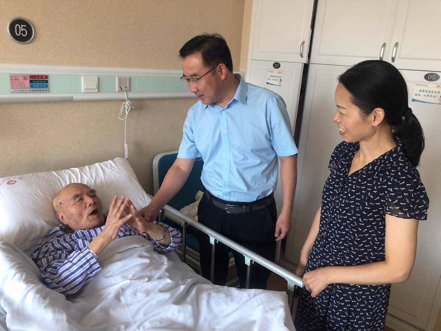 周老是学校唯一健在的抗战老干部,是学校的宝贵财富,因身体原因常年住院。在慰问中,离退休党工委书记沈洪涛与周老仔细交谈,深入了解了周老的生活起居和健康状况,询问他在生活上遇到的困难,转达了学校领导对他的诚挚问候和美好祝福。