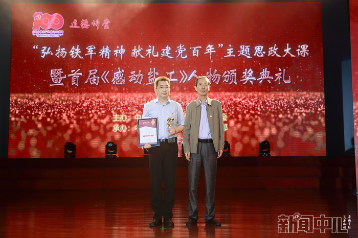 党委副书记、校长方海林向萧建波颁发“感动盐工”人物证书和奖杯