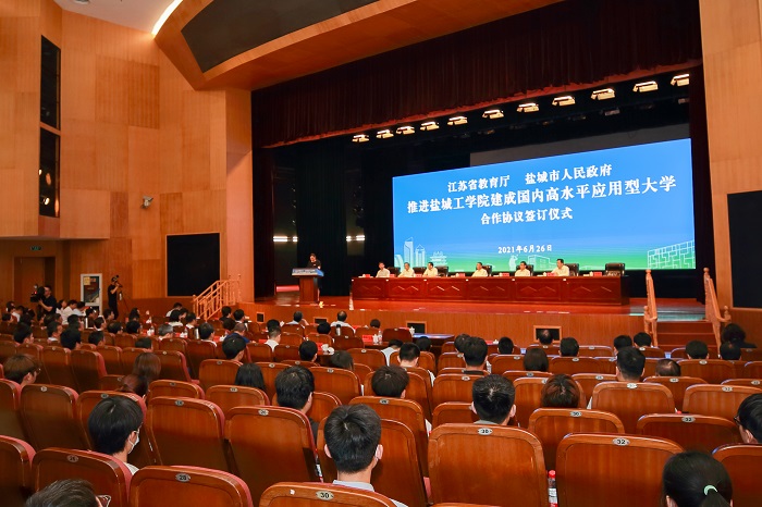 6月26日下午,江苏省教育厅和盐城市政府在我校行政楼一楼报告厅举行签约仪式,共同推动盐城工学院建成国内高水平应用型大学。盐城市委书记戴源、市长曹路宝,省教育厅副厅长潘漫,副市长费坚,我校党委书记刘祖汉、校长方海林等出席活动。盐城市政府秘书长刘光球主持签约仪式。