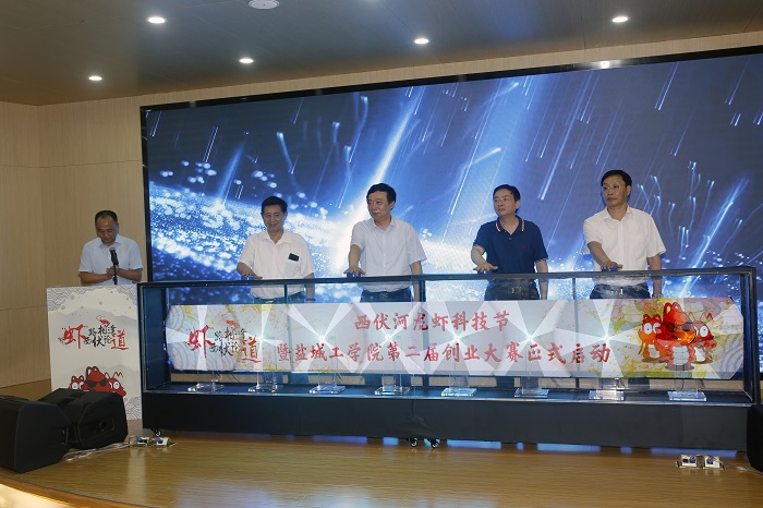 副校长王路明、市科技局副局长石春山、盐南高新区副主任王永辉、民进盐城市委副主委张永辉等启动西伏河龙虾科技节暨盐城工学院第二届创业大赛