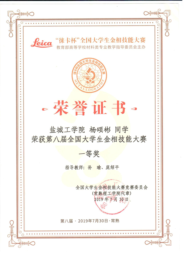 10月9日至14日,“徕卡杯”第十届全国大学生金相技能大赛在上海交通大学举行。我校材料科学与工程学院张纪元同学获得一等奖,聂新怡、王中发同学获得二等奖。材料学院孙瑜、庞绍平、宋娟3位老师获得“优秀指导教师”称号。大赛授予孙瑜老师全国大学生金相技能大赛十周年一级荣誉勋章。至此,我校学生已连续7年获得该赛事一等奖。