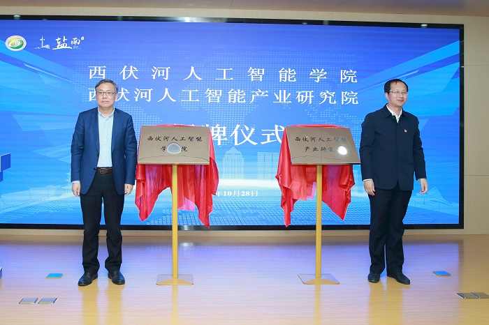 校党委书记刘祖汉和盐南高新区党工委书记、管委会主任高尚德共同为“西伏河人工智能学院、人工智能产业研究院”揭牌。