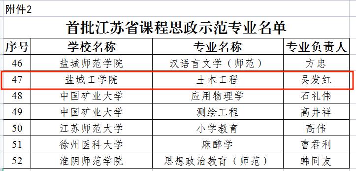 根据《省教育厅关于公布首批江苏省课程思政示范高校和示范专业名单的通知》(苏教高函〔2021〕13号)文件,在我省首批52个课程思政示范专业中,我校土木工程专业名列其中。