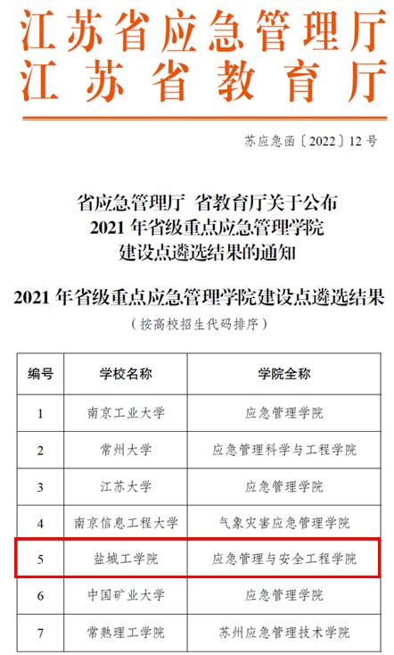 近日,江苏省应急管理厅、教育厅联合公布《关于2021年省级重点应急管理学院建设点遴选结果》,我校应急管理与安全工程学院获选省级重点应急管理学院建设点。此次入选省级重点应急管理学院建设点是江苏省政府支持我校应急管理与安全工程学院高质量发展的又一重要举措。