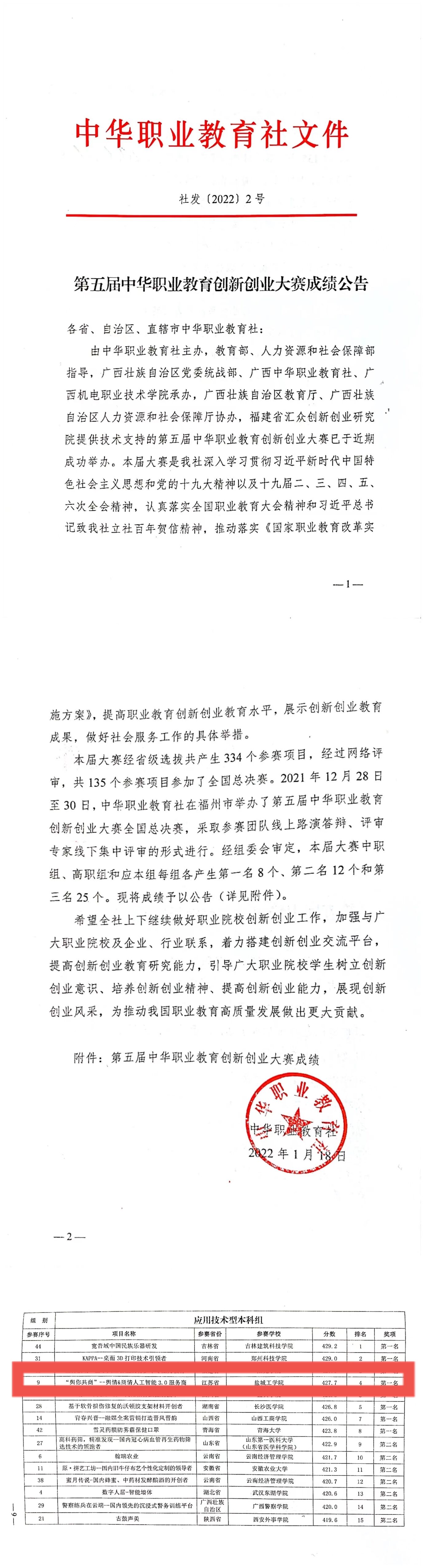近日,由教育部、人力资源和社会保障部指导,中华职业教育社主办的第五届中华职业教育创新创业大赛成绩公布,我校《“舆”你共商——舆情&商情人工智能多场景应用服务商》项目获应用型本科组第一名,同时也是本次大赛江苏省唯一一个获得第一名的团队。