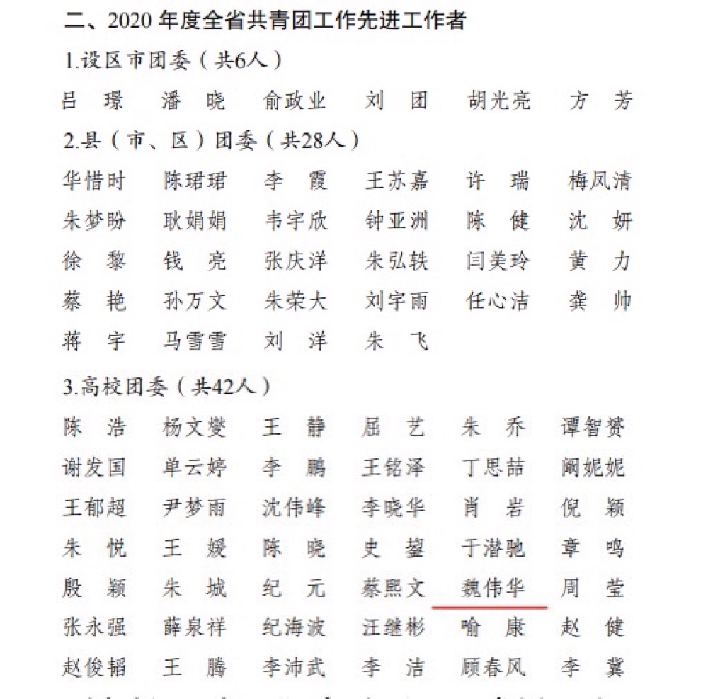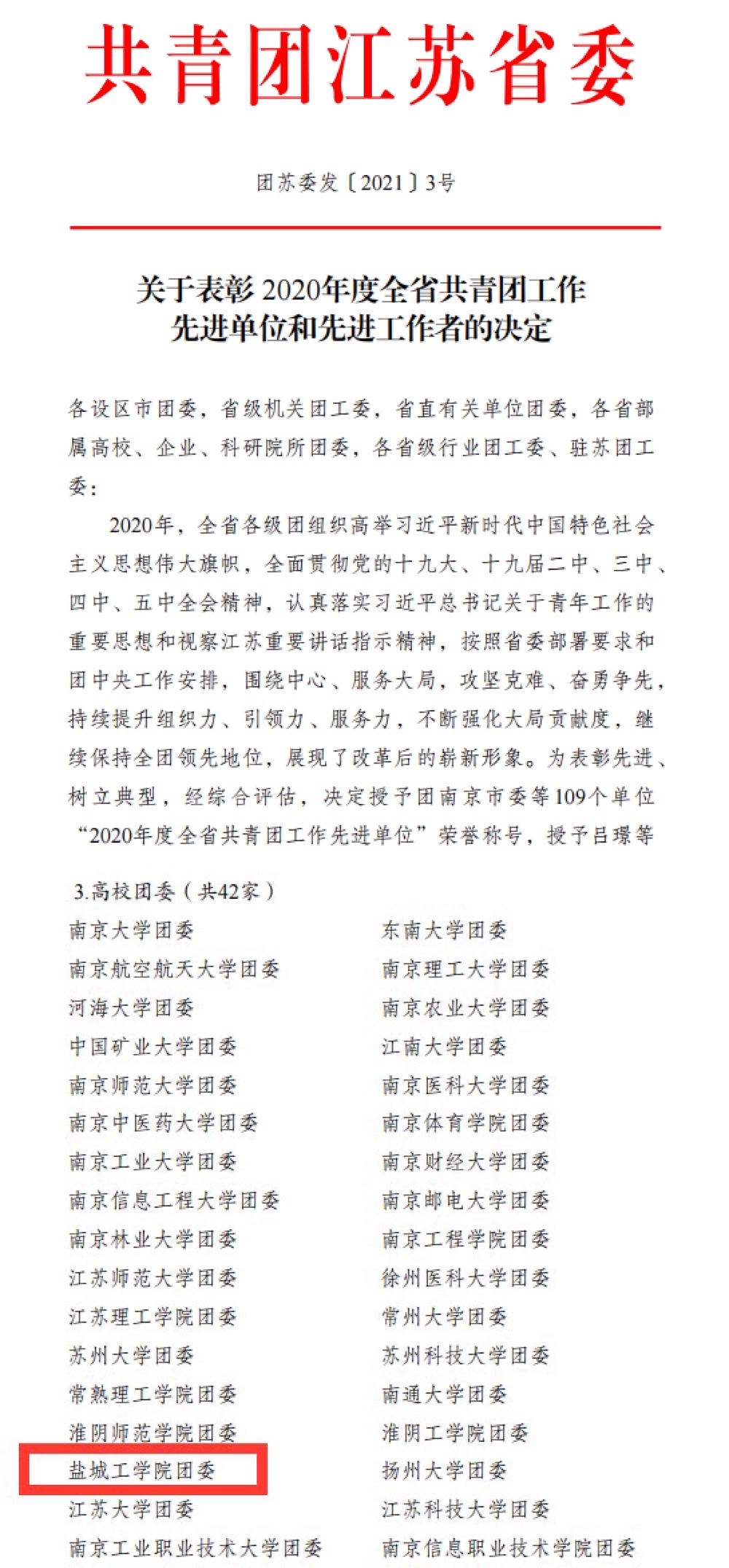 近日,共青团江苏省第十五届委员会在南京召开第六次全体会议,回顾总结2020年工作情况,分析当前工作形势,研究部署2021年工作任务。省委副书记张敬华出席会议并讲话。会议还对2020年度全省共青团工作先进单位、先进工作者进行了表彰。我校团委荣获2020年度全省共青团工作“先进单位”,团委副书记魏伟华荣获2020年度全省共青团工作“先进工作者”称号。