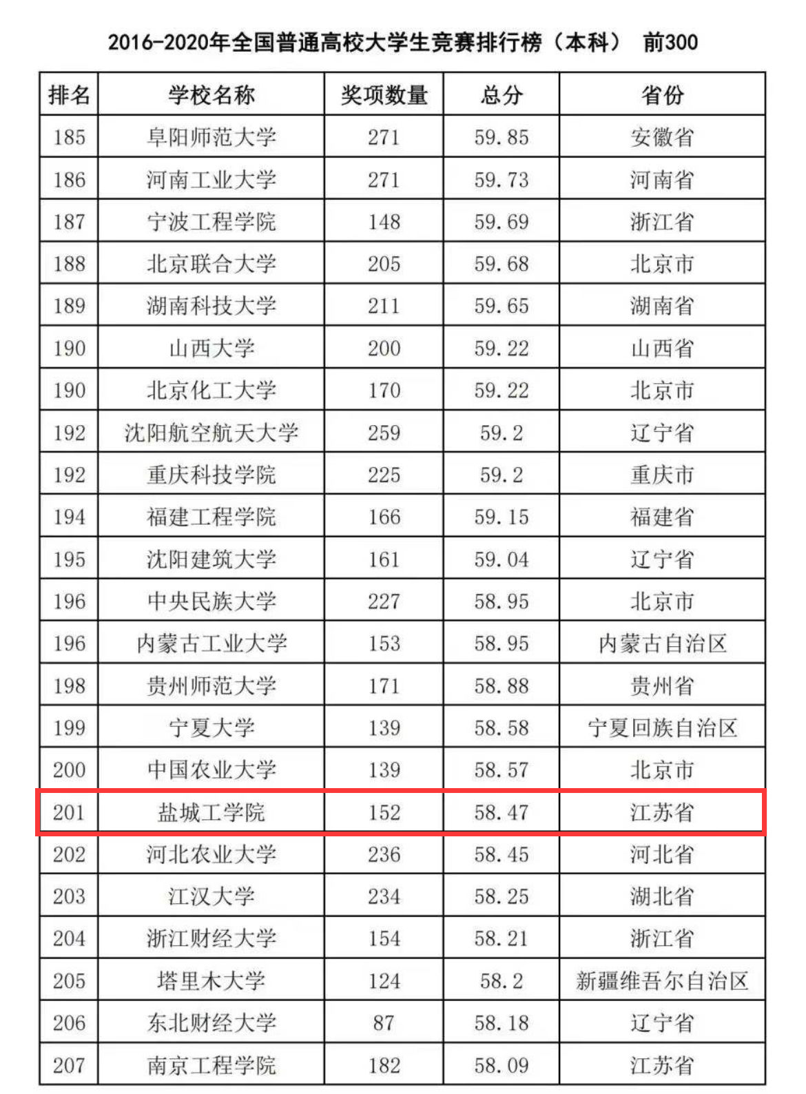 3月22日,中国高等教育学会高校竞赛评估与管理体系研究工作组发布了2016-2020年全国普通本科高校大学生竞赛排行榜(TOP300),我校位列201位,比2019年前进了73位。