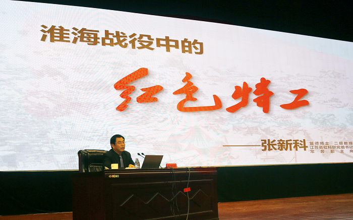 张新科在题为《淮海战役中的红色特工》的报告中,分别从淮海战役的正面战场、支前民众、隐蔽战线三个方面,介绍了淮海战役的背景和过程,重点讲述了郭汝瑰、刘君湘、钱树岩、何基沣、张克侠、萧德宣、廖运周等老一辈红色特工为革命事业牺牲奉献的感人事迹,分析了他们为新中国建立作出的突出历史贡献,阐释了地下党员坚守信仰、不怕牺牲的优秀品质。最后,他号召大家学习党史,走进英雄,走进信仰,走进崇高;珍惜生活,热爱生活,创造生活。