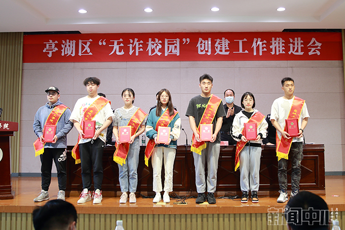 推进会上,杨洪锦就开展“无诈校园”创建工作的目的、意义,抓好创建的重点环节、关键措施,加强创建的警、校、宣的协同推进为“无诈校园”创建工作提出指导性意见。周晓琴通报了亭湖区电信网络诈骗情况。主席台领导还为被亭湖公安分局聘请的我校15名大学生“反诈宣传员”颁发聘书,土木工程学院学生会副主席张思婕同学作为“反诈宣传员”代表作表态发言。
