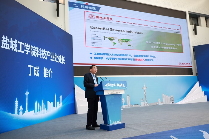 盐城市科技局局长戴勇提出了科教融合、产教融合、校企合作的展望,盐南高新区党工委书记高尚德介绍了盐南高新区的情况及科技发展现状,盐城市科技局副局长石春山介绍了盐城产业及科技发展情况,我校科技产业处处长丁成作了科研团队和科技成果的专题推介。