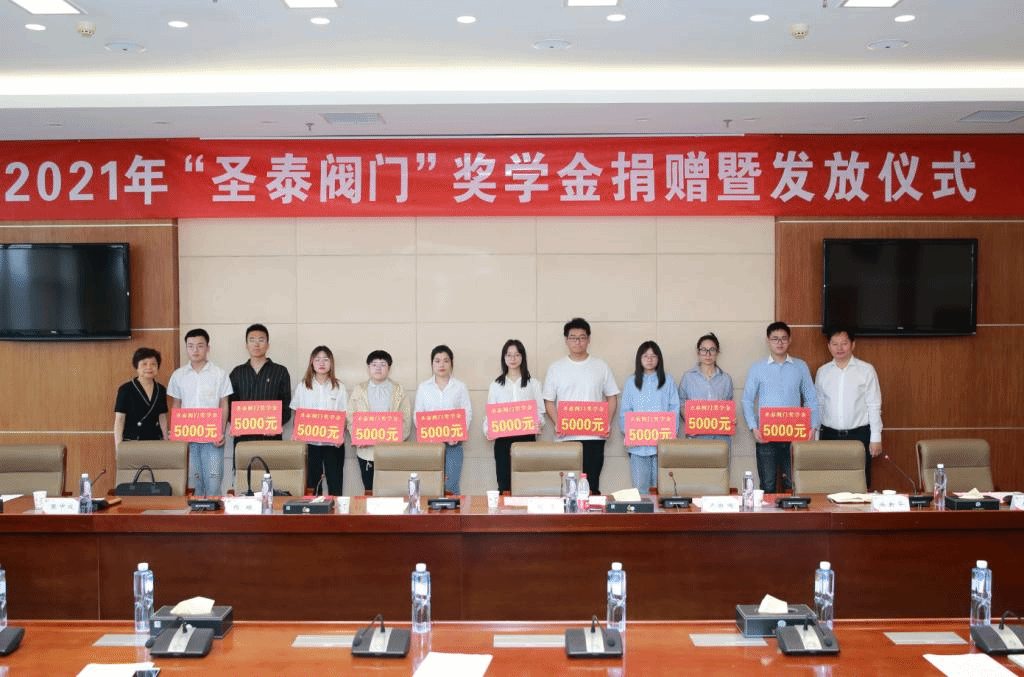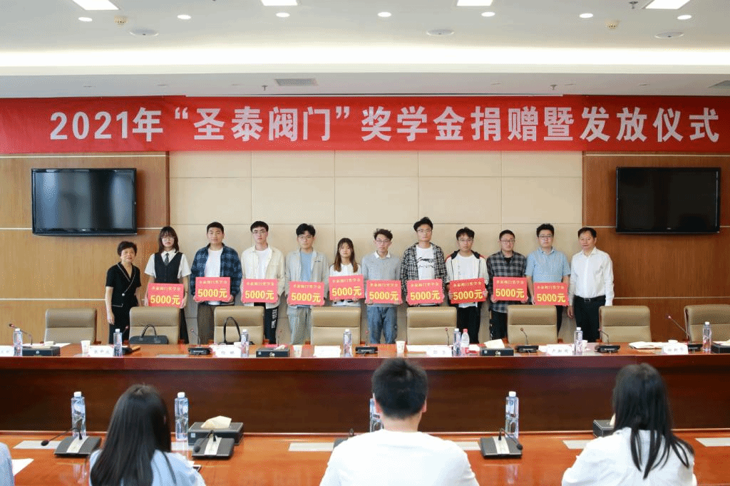6月4日下午,2021年“圣泰阀门”奖学金颁奖仪式在南校区行政楼930会议室举行。副校长邵荣,江苏圣泰阀门有限公司董事长、总经理严涛,副总经理杨琳,我校校友工作办、学生处、财务处、招投标办等负责同志、师生代表参加。学生处处长徐新华主持本次活动。