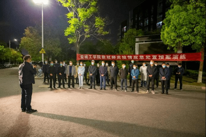 为高效应对校园新冠肺炎疫情突发事件,科学有效评估学校疫情应急处置能力,4月27日晚8:00,学校在希望大道校区举行夜间新冠肺炎疫情应急处置演练。盐城市疾控中心首席专家姜仁杰、亭湖区疾控中心副主任卢正祥、亭湖区东亭湖街道卫生服务中心主任倪同高以及亭湖区教育、疾控、公安、市场监管、社区等属地“五大员”现场全程指导。我校党委常委、副校长邵荣、宋长春出席活动并指挥演练。校突发新冠肺炎疫情应急工作领导小组下设各工作组组长、部分成员及部分二级学院党委(总支)书记参加。