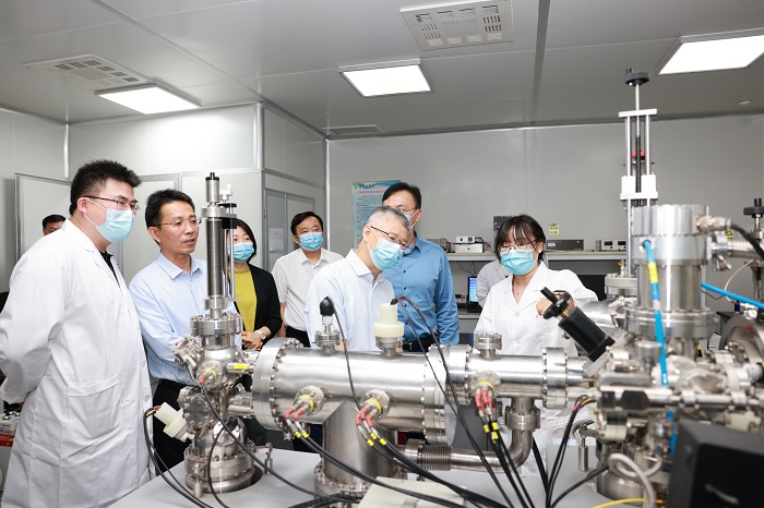 景茂一行对固废资源化、CO2固结及负碳材料、秸秆生态建材固碳技术、清洁能源及储能材料等实验室进行了重点考察。侯贵华教授介绍了基于新型低碳节能水泥平台研发的新型低碳水泥突破了传统水泥组成和硬化方法的束缚,降低了水泥混凝土制造过程中的碳排放量,可有效解决水泥行业高污染和高能耗的两大难题;关荣锋教授介绍了其工业烟气监测平台,展示了团队自主研发的可同时检测多污染物的传感器检测模块,从而实现对工业环境烟气的实时在线智能监测。王珏博士介绍了原子团簇研究团队自主搭建的 “高分辨质量选择团簇束流实验装置及在线催化测试系统”。