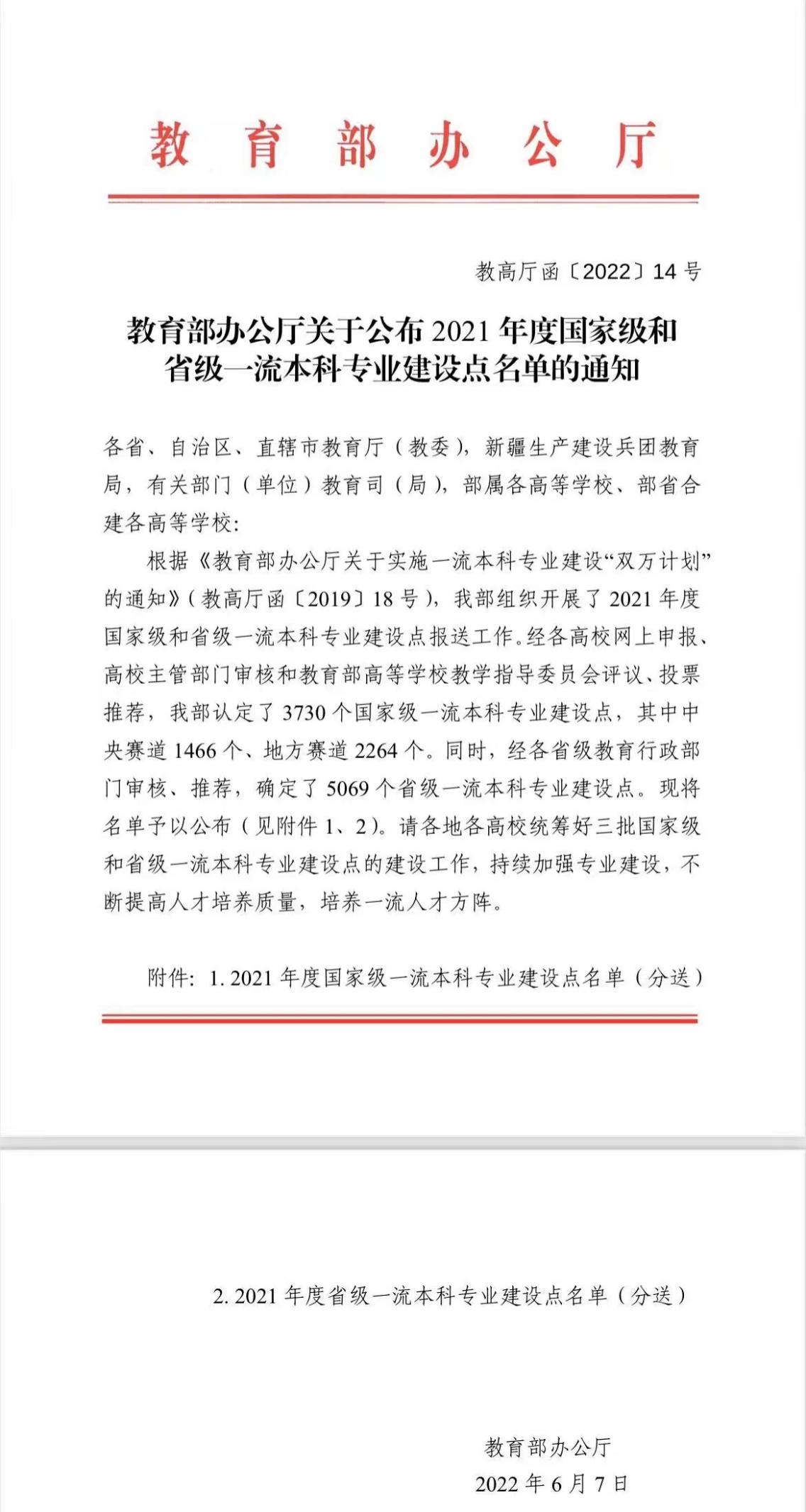 近日,教育部发布了《关于公布2021年度国家级和省级一流本科专业建设点名单的通知》(教高厅函〔2022〕14号),我校本科专业建设工作再创佳绩,成功入选15个专业,其中过程装备与控制工程、电子信息工程、给排水科学与工程、制药工程、纺织工程、食品科学与工程等6个专业获批国家级一流本科专业建设点,机械电子工程等9个专业获批省级一流本科专业建设点。