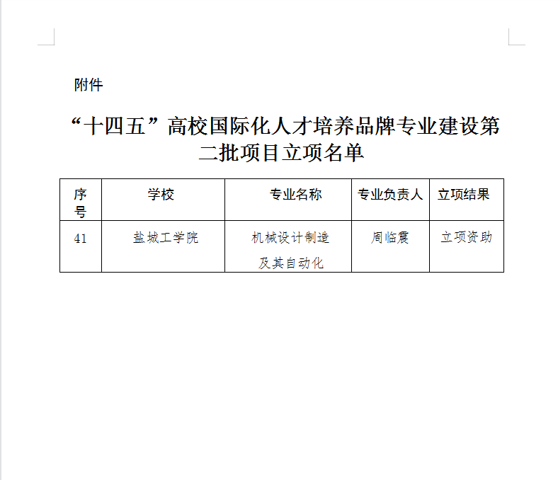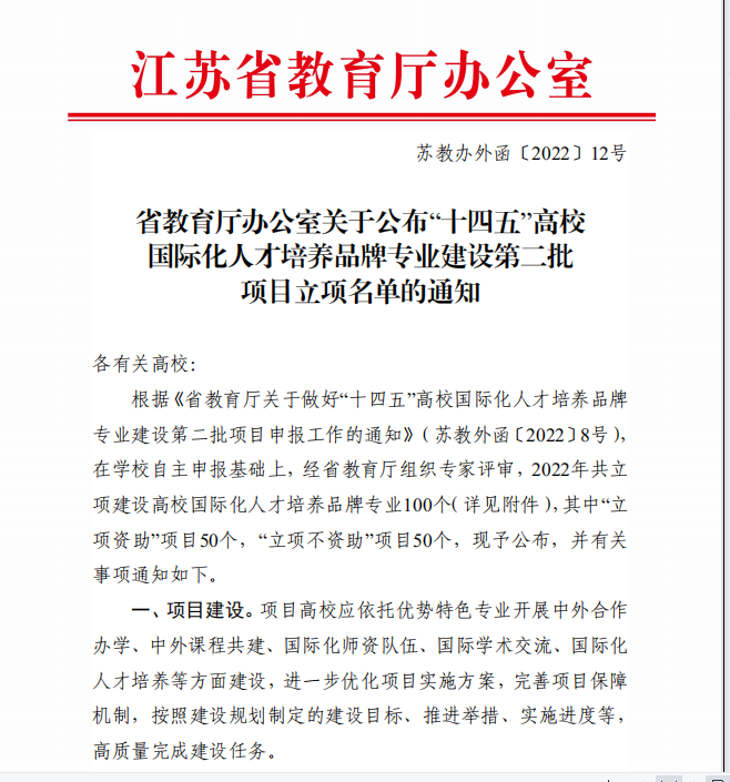 近日,省教育厅发布了《关于公布“十四五”高校国际化人才培养品牌专业建设第二批项目立项名单的通知》(苏教办外函〔2022〕12号),我校机械设计制造及其自动化专业获得省“十四五”高校国际化人才培养品牌专业建设项目,并获得立项资助。该专业获得国家级一流本科专业建设点、教育部卓越工程师培养计划专业、国家级特色专业、江苏省高校品牌专业建设工程专业、江苏省重点专业,并与英国格林威治大学合作举办本科教育项目,通过国际工程教育专业认证。该专业所在的学科被评为江苏省重点学科,进入工程科学ESI全球排名前1%。