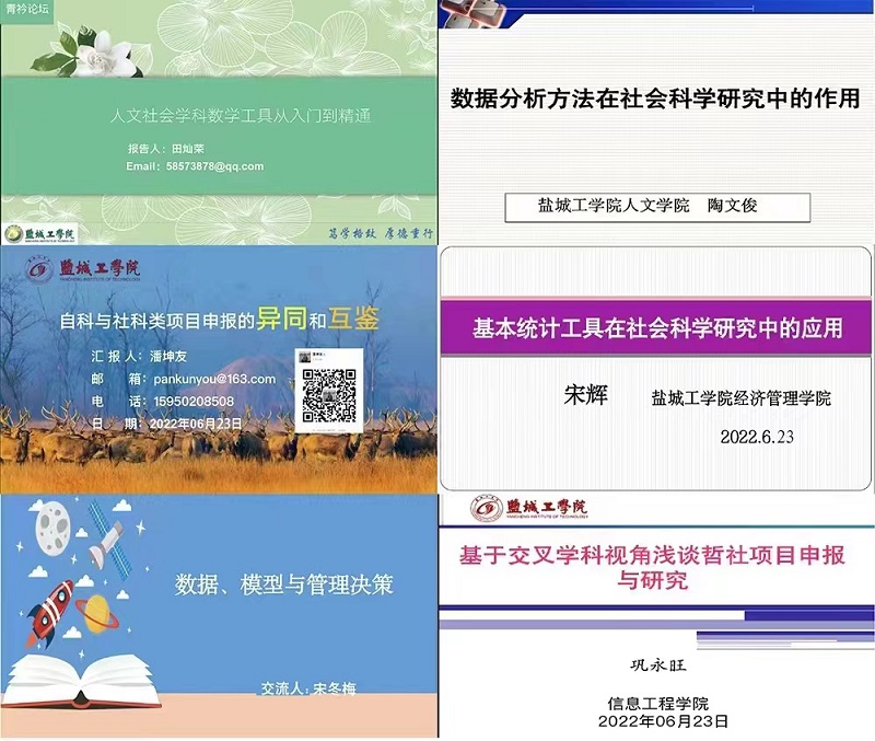 数理学院田灿荣教授以“人文社会学科数学工具从入门到精通”为主题介绍了大数据与社会学科交叉研究的方法创新与实践探索;人文学院陶文俊副教授以“数据分析在人文社科研究中的作用”为主题介绍了自己对学科交叉研究的认识和数据分析方法在课题研究中的使用;经管学院潘坤友教授以“自科与社科类项目申报的异同和互鉴”为主题解读了自然科学研究与社会科学研究的异同和互鉴以及课题申报策略;经管学院宋辉教授以“基本统计工具在社会科学研究中的应用”为主题演示了“灰色理论”“对数平均迪氏指数因素分解法”等统计工具在交叉学科研究中的应用;经管学院宋冬梅副教授以“数据、模型与管理决策”为主题介绍了社会科学研究中数据研究的重要性、数据获取的方法和数据的治理;信息学院巩永旺教授以“从学科交叉视角浅谈教育部人文社科项目申报与研究”为题分享了基于交叉学科视角申报与研究哲社类项目的经验。