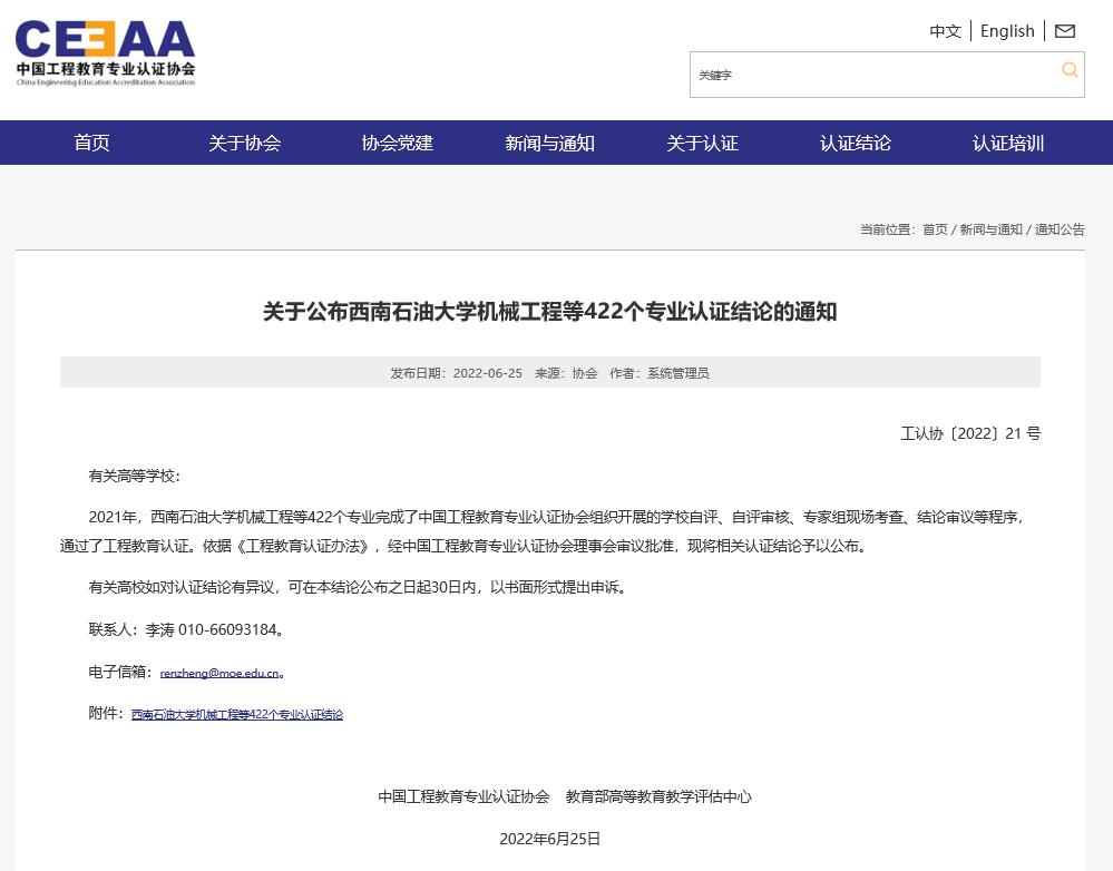 近日,由中国工程教育专业认证协会、教育部高等教育教学评估中心联合发布《关于公布西南石油大学机械工程等422个专业认证结论的通知》(工认协〔2022〕21号)和《关于公布北京工业大学机械工程等460个专业工程教育认证中期审核结论的通知》(工认协〔2022〕22号),我校制药工程专业经过学校自评、自评审核、专家组现场考查、结论审议等程序,通过了工程教育认证,有效期为6年(2022年1月至2027年12月)。至此,我校共有7个专业通过工程教育认证。同时我校化学工程与工艺、机械设计制造及其自动化两个专业通过工程教育认证中期审核。