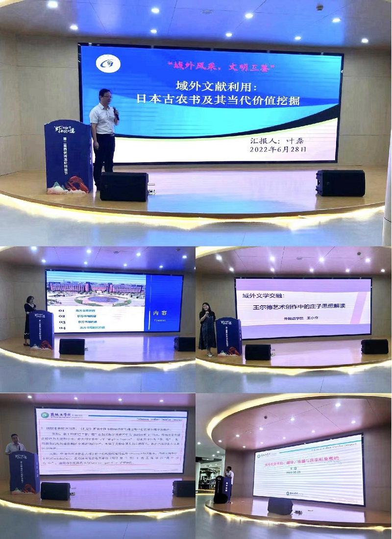 外国语学院叶磊老师以“域外文献利用:日本古农书及其当代价值挖掘”为主题、王奇老师以“域外形象建构:翻译、传播与国家形象塑造”为主题、薛玉秀老师以“域外人物解构:狄金森东方书写及时代价值探究”为主题、周学恒老师以“域外文化传播:《利玛窦中国札记》与中西饮食文化交流”主题、王小立老师以“域外文学交融:王尔德艺术创作中的庄子思想解读”为主题进行了交流,范祥涛教授对交流内容逐一进行点评。
