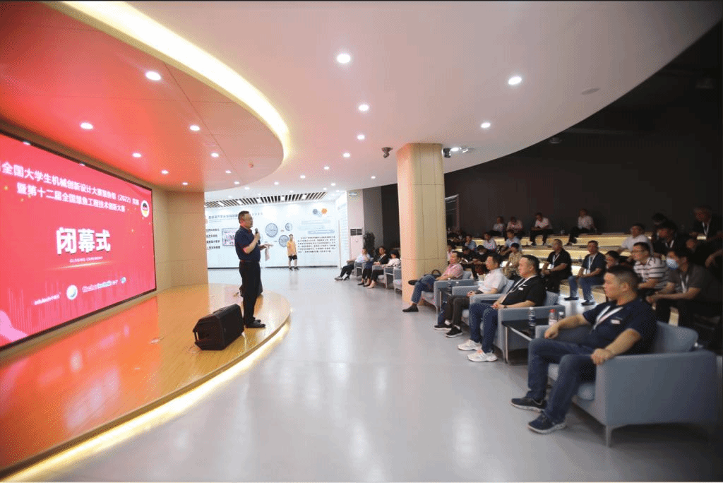 全国大赛组委会秘书长、本届竞赛评审委员会主任、西安交通大学王晶教授致闭幕词。他对评审专家公正严谨的评审表示敬意,对承办单位北京中教仪人工智能科技有限公司和盐城工学院的周到服务表示感谢,对参赛师生的绝妙创意表示赞叹。他指出,全国大学生机械创新设计大赛不仅仅是单纯意义上的竞争和比赛,更是同学们施展本领、展现思维与实践动手能力的舞台,大家在这里互相交流、互相学习、共同进步,希望未来能有更多的师生加入到机械创新设计大赛中来。