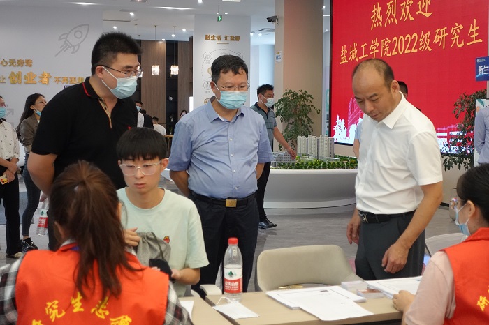 学校党委常委、副校长崔刚,副校长王伟、张勤芳,盐城高新区党工委副书记李晓东,学校宣传部、纪委机关、安保处、机械学院、化工学院、环境学院等相关部门负责人,盐城高新区相关部门来到新生报到点和研究生公寓,检查指导研究生迎新工作,看望前来报到的研究生新同学,慰问服务在迎新一线的教职工和学生志愿者。