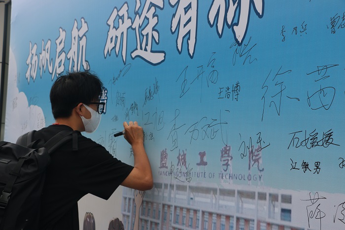 新生报到点汇文公馆内洋溢着喜庆、热烈的气氛,研究生工作部专门设计制作了各类文化墙、合影板、签名展板等,让新生一进入大门就感受到浓郁的文化氛围。迎新现场,报到流程清晰详细、秩序井然,老师和学生志愿者们热情的话语、周到的服务让前来报到的新生倍感亲切。校领导仔细询问新生报到流程、迎新各项工作进展,叮嘱相关部门要始终坚持以学生为中心,精心组织、密切配合。盐城高新区领导与校领导共同为家庭经济困难学生代表颁发了“爱心礼包”和助学金,与前来报到的新生亲切交谈,勉励他们培养积极探索、善于创新的科研能力和勇于担当、严谨求实的学术素养。