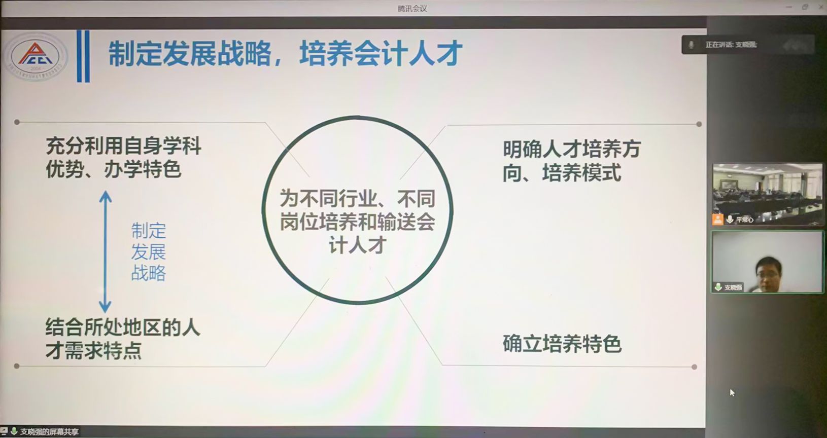 支晓强教授简要介绍我国MPAcc教育的改革与发展历程,从“制度建设、发展战略、案例教学、质量认证”等层面指导我校MPAcc建设方向和实施路径,介绍专项评估工作概况、评估方案、关键指标,并就MPAcc教育中心的机构设置、人员配备、经费保障等方面对我校会计专业硕士研究生教育提出指导意见。支教授还鼓励我校会计学专业师生踊跃参与“三大交流平台”、MPAcc案例大赛、各类论坛及研讨会、会计名家公益大讲堂,学习借鉴国内先进高校的做法,通过“创新教学方法”“深化校企合作”“改革人才培养模式”“打造‘9+1’会计人员职业能力框架”保障人才培养质量。