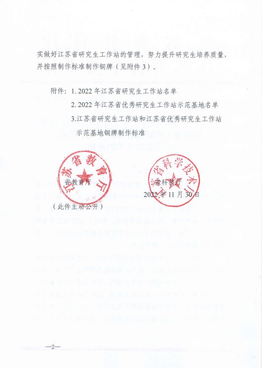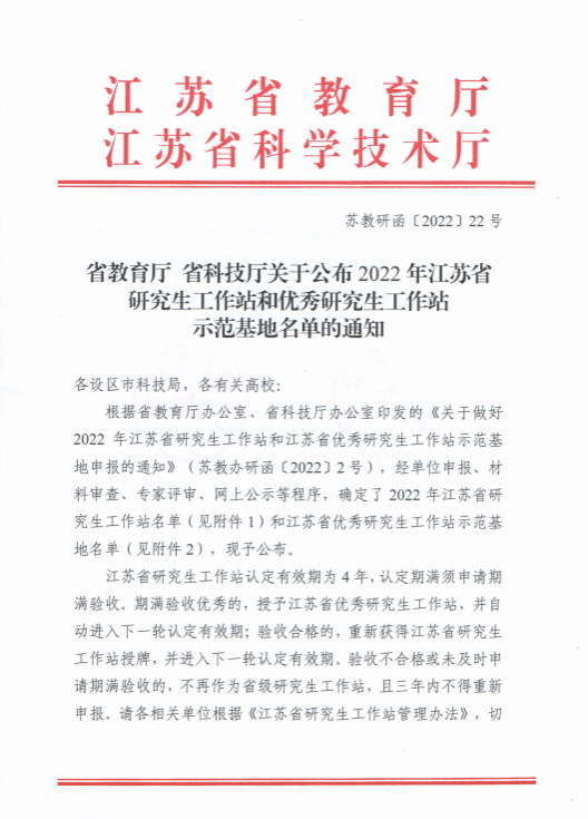 江苏省研究生工作站是为研究生开展科技创新、成果转化实践和学位论文研究而设立的,对于深化研究生教育综合改革、创新研究生培养模式,促进科教融合、产教融合,推动研究生教育主动融入经济社会发展有着重要作用。近年来,我校高度重视研究生工作站的建设工作,从人才培养根本出发,不断完善研究生实践培养规章制度,加大政策支持力度,积极推进各学位点与地方知名企业开展研究生工作站共建工作,不断深化产学研协同育人机制,切实提高了我校研究生的实践创新能力,提升研究生培养质量。